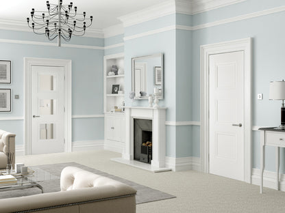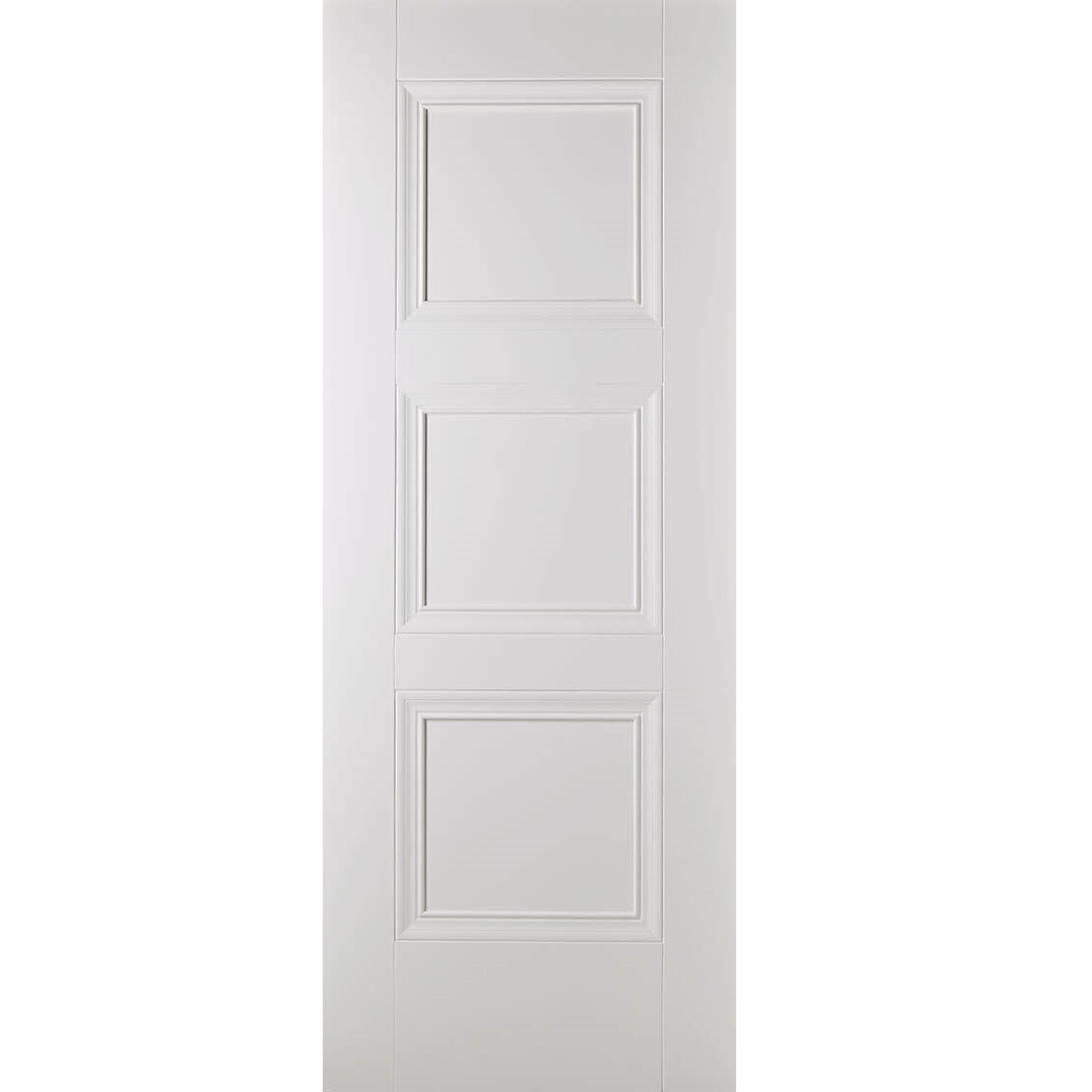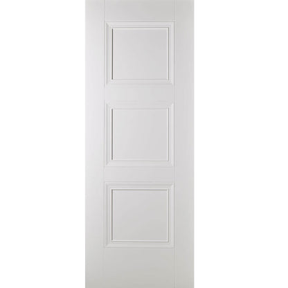 This white primed door features three equal sized panels, framed by decorative beading, forming a stylish finish.