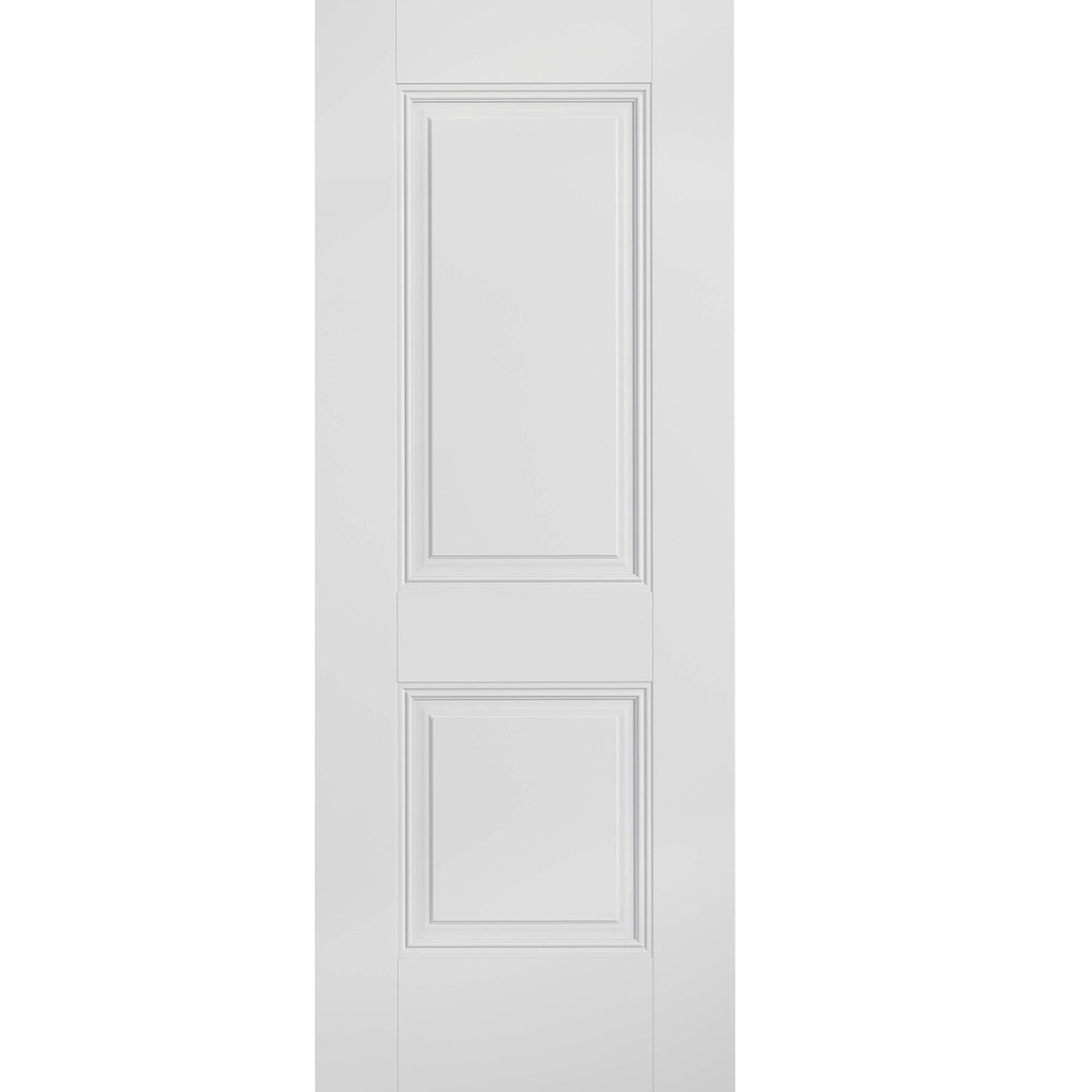 A sophisticated white door design formed by two panels, one larger and one smaller, surrounded by decorative beading.