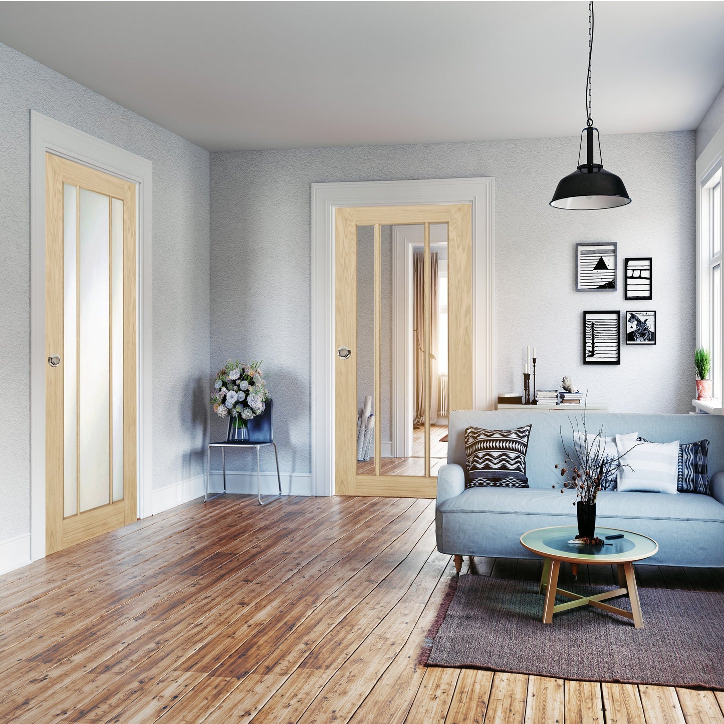The distinctive Oak Langdale Frosted Glass internal door, has a full length glazed central panel featuring frosted toughened safety glass. The dowel construction forms two slim vertical struts, dividing the door into a central panel and two elegant side lights. (please note the 610mm door middle pane is narrow due to the narrow width of the door). Perfect for creating a light, spacious open ambiance. This style is very versatile and could be used in any style of home. Frosted safety glass in accordance with BSEN 12150 and marked accordingly in the bottom right hand corner of each pane