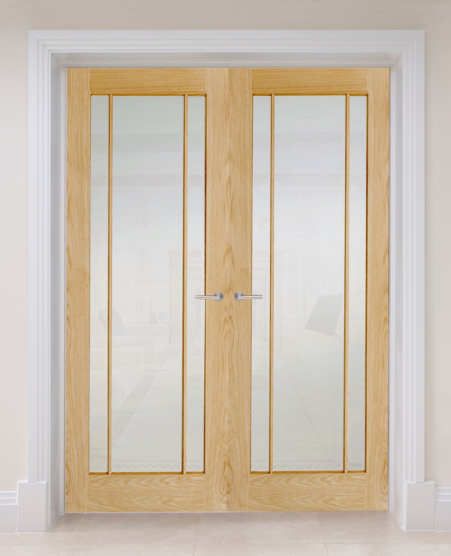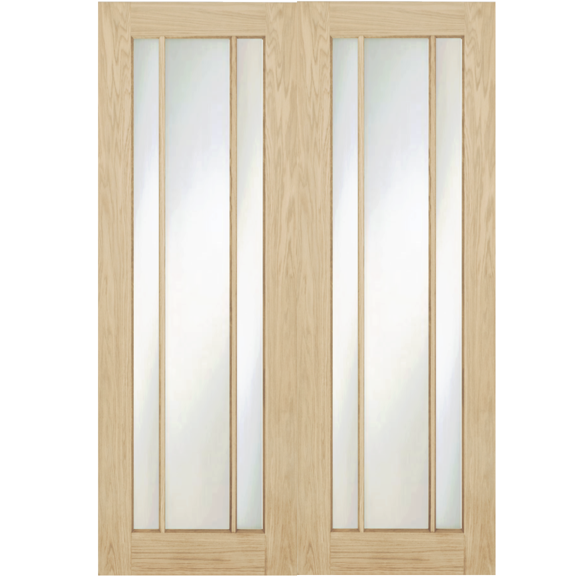 This door pair is in unfinished oak and is available in 4 sizes. Frosted toughened safety glass in accordance with BSEN 12150 and marked accordingly in the bottom right hand corner of each pane.
