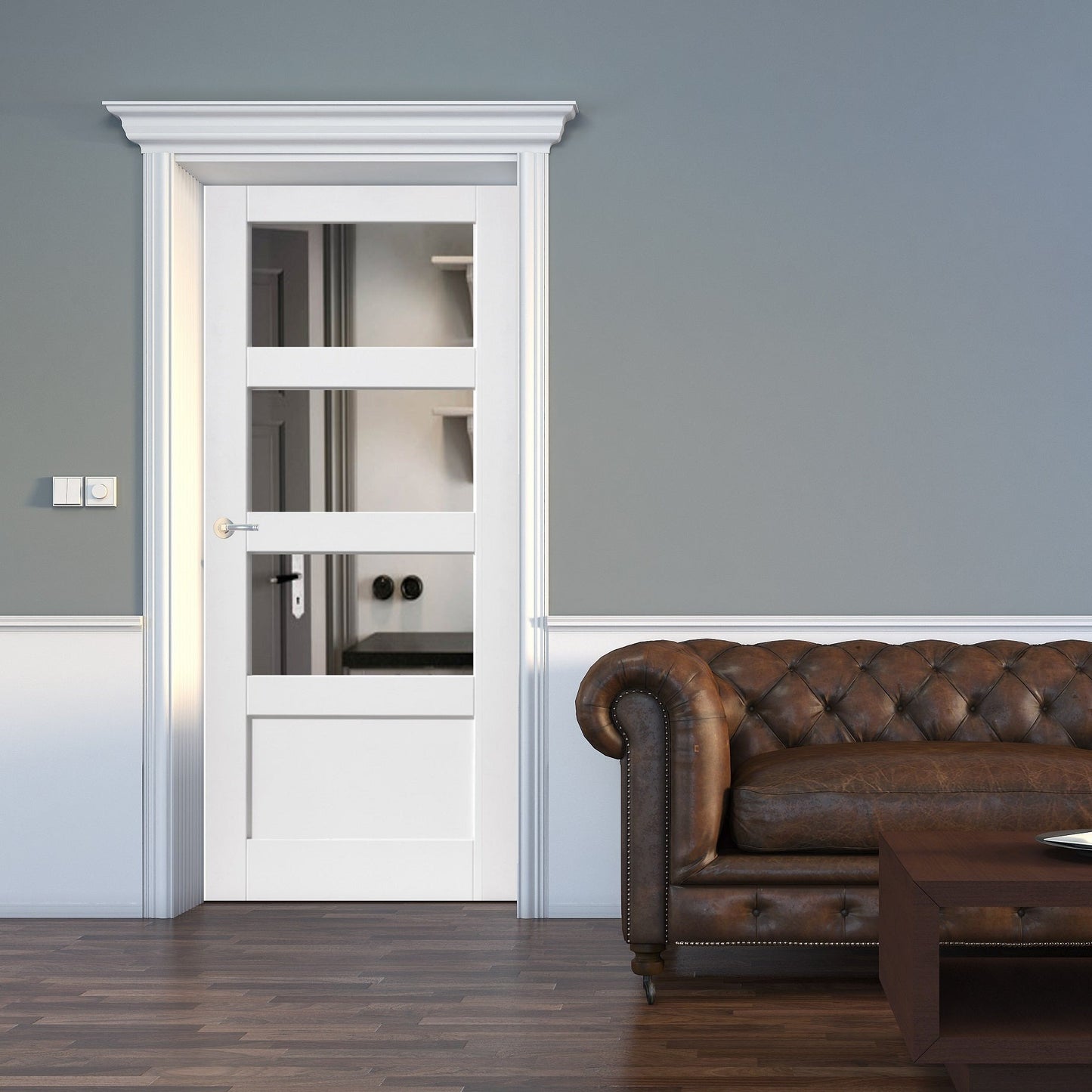 The White Shaker 3 Light 1 Panel Clear Pocket Door combines a classic shaker design with clear glass to give a door that will be at home in any property. The clear toughened safety glass allows for a high degree of light to move between rooms. This door is available in a range of sizes, all at 35mm thick.